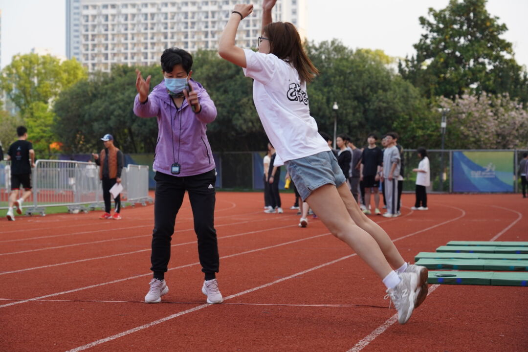 集训的教师团队也在训练的过程中根据同学们的实际情况,不断调整运动强度。他们仔细地讲授、示范立定跳远、仰卧起坐、跑步等体测项目的练习要点和提升方法,注重培养同学们的耐力、速度、力量和灵活性,并带领同学们针对各个项目开展素质训练。