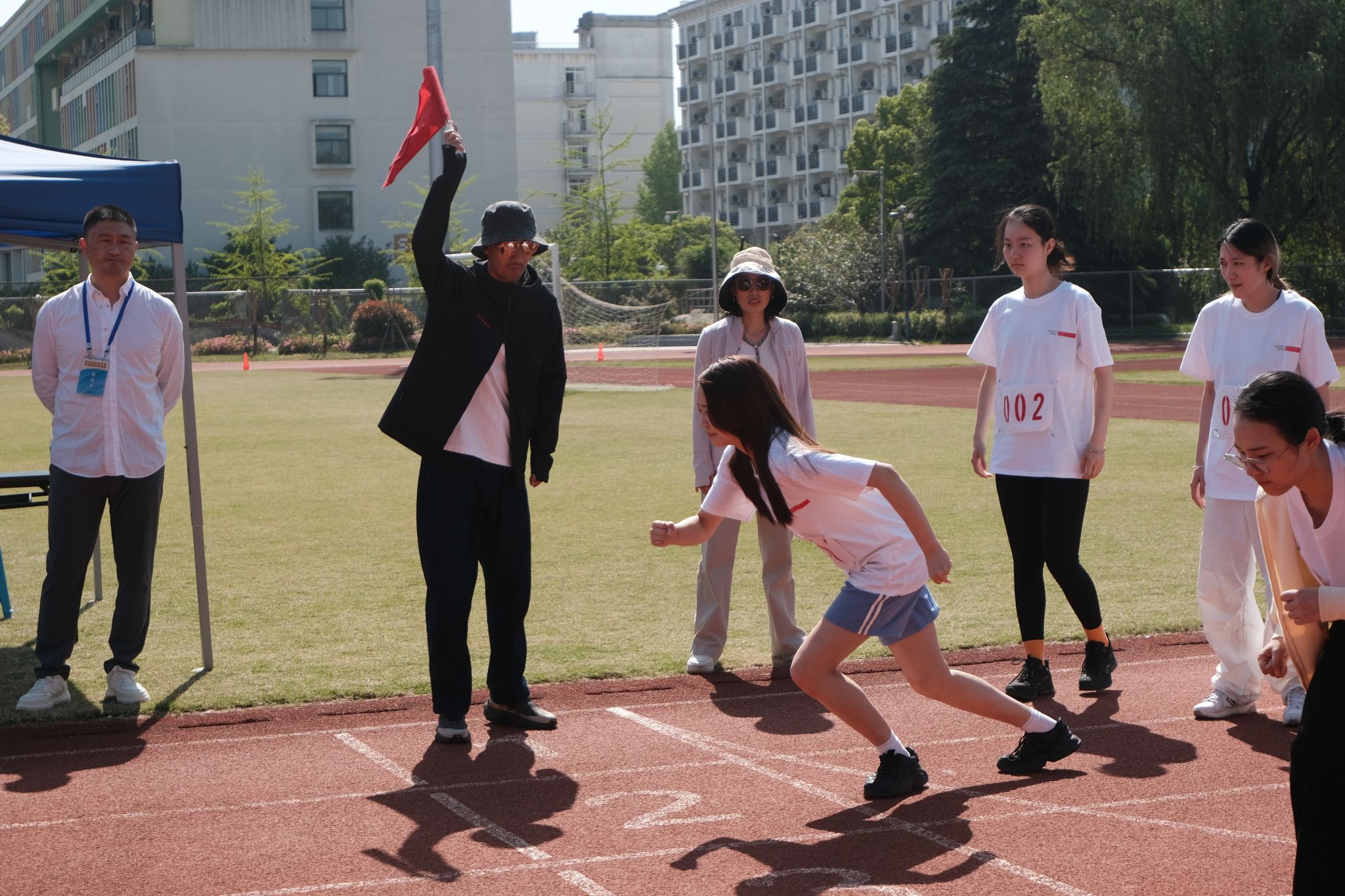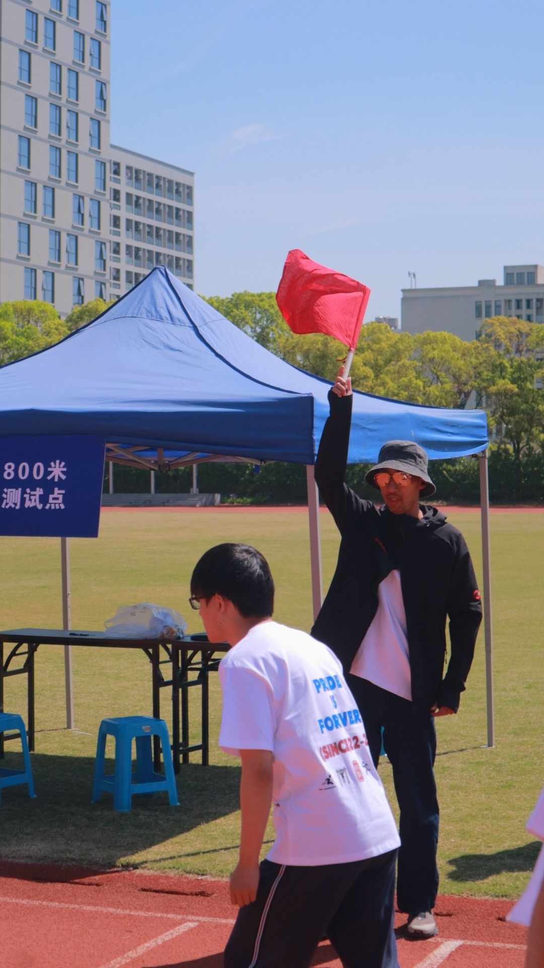 4月16日清晨,Xdxx 直属党支部书记薛林峰带领体育教师在田径场检查测试仪器和标识,确保每个测试环节万无一失。