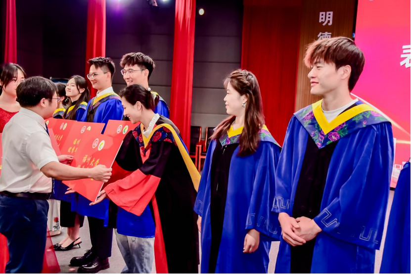 典礼的高光时刻属于学位授予环节。江莉龙副校长和学院学位评定分委员会委员为毕业生逐一拨正流苏、授予学位证书,并握手祝福。当流苏从右向左,毕业生们正式从学生蜕变为校友