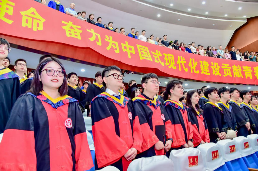 毕业典礼在庄严的国歌声中拉开帷幕。全体师生肃立,齐唱国歌雄壮嘹亮的歌声回荡在会场,也激荡在每位毕业生的心间。