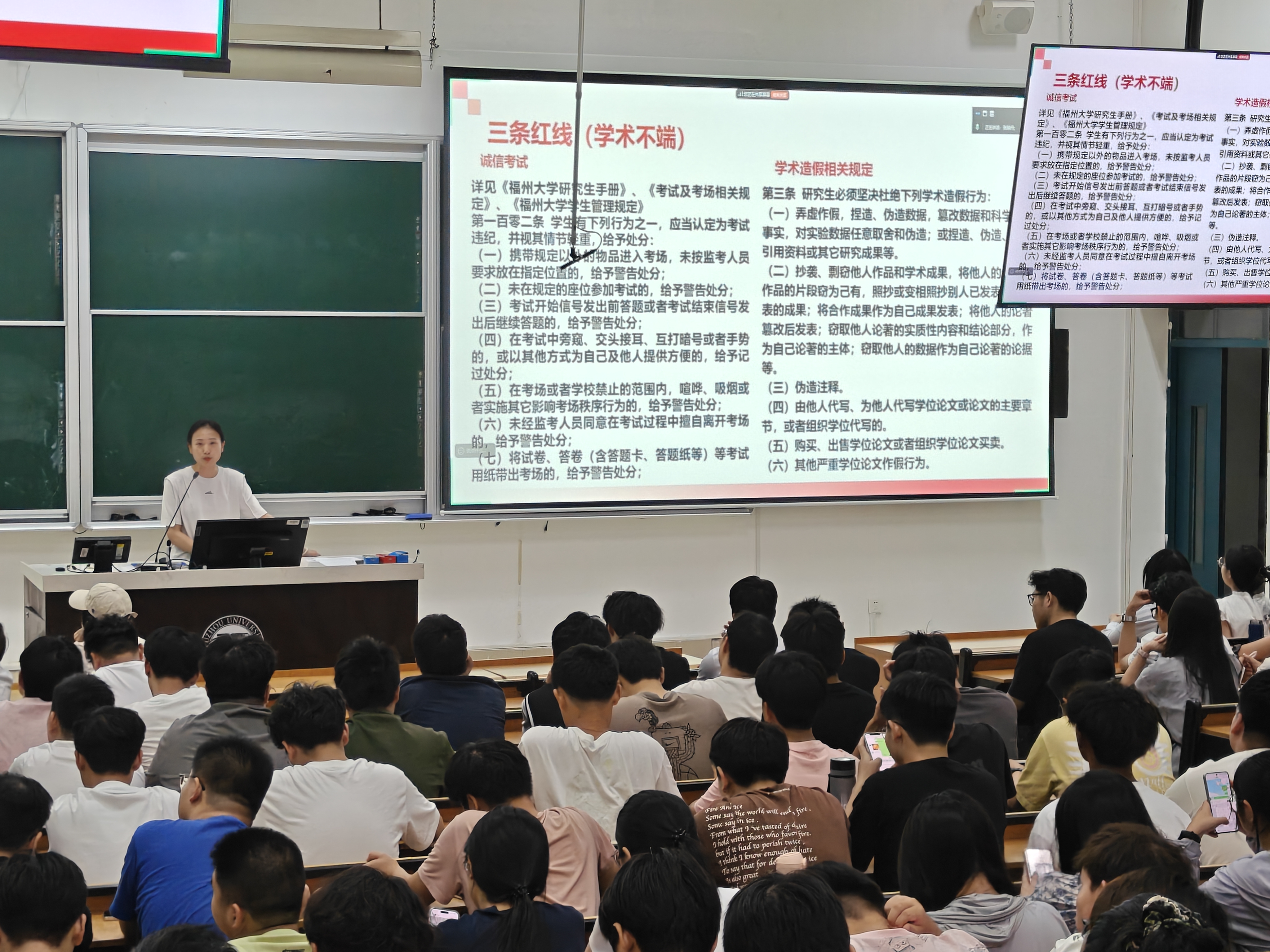 2025级研究生新生辅导员张琼丹主持《福州大学研究生手册》领学活动,聚焦纪律与管理规范,着重强调“三条红线”——严禁擅自夜不归宿、学术不端与违法乱纪行为,引导新生牢固树立规则意识,自觉遵守校纪校规。